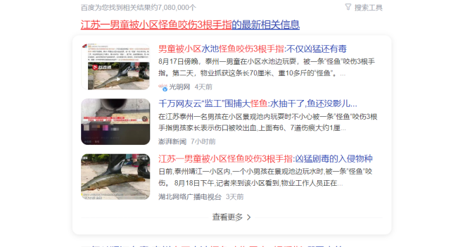 现在,我们只要随便搜索一下,就能找到一大堆关于鳄雀鳝的信息,前几天江苏一个小男孩被一条鳄雀鳝咬伤三根手指头的新闻刚刚在上了热搜。