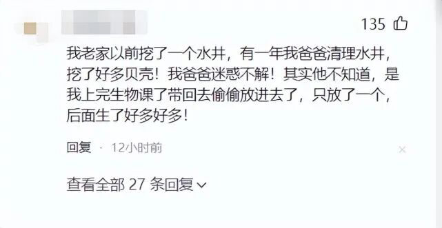 这个新闻源下面有一个热门的留言,他说自己老家曾经挖了一个水井,有一年他爸在清理水井的时候发现了很多贝壳,他爸百思不得其解这些贝壳怎么来的,而他一直没有说那是自己放下去的。