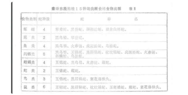 一项对秦岭蛇类的研究中,研究人员发现,只有极少部分蛇的食谱中包括老鼠,而大部分蛇的主要食物来源都是青蛙等两栖动物,另外还有昆虫、软体动物,鱼类等等。