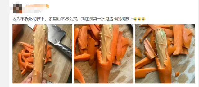这名博主声称自己很少购买胡萝卜,第一次碰到这种情况,同时也觉得很有趣,然后就上网询问这是啥情况了。
