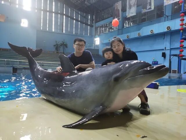 图:这个照片是我们家三口和海豚的合影,海豚皮肤表面没有可见的毛发
