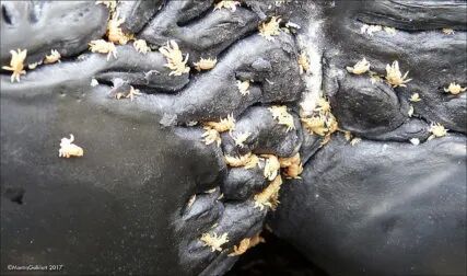 一旦它们靠近鲸鱼,藤壶幼虫会嵌入鲸鱼皮肤并留在那里,随着它们的成长,它们在自己周围形成坚硬的外壳来覆盖柔软的内部,并进一步深入鲸鱼的皮肤以获得良好的抓握力。