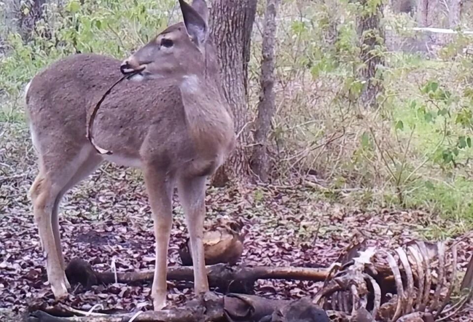 据《每日邮报》报道,国外一户外博主在媒体上分享了一段22秒的视频,视频中,一只鹿正在得克萨斯州的路边若无其事地、安静地咀嚼食物。看似平常,当镜头拉近后,猛然发现,鹿嘴里挂着一条长长的蛇。