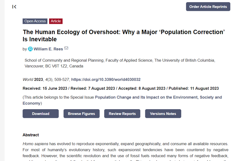 这项研究由加拿大不列颠哥伦比亚大学人口生态学家威廉·里斯发表,他已经累计发表了150多篇有关增长和社会经济发展的同行评议论文。