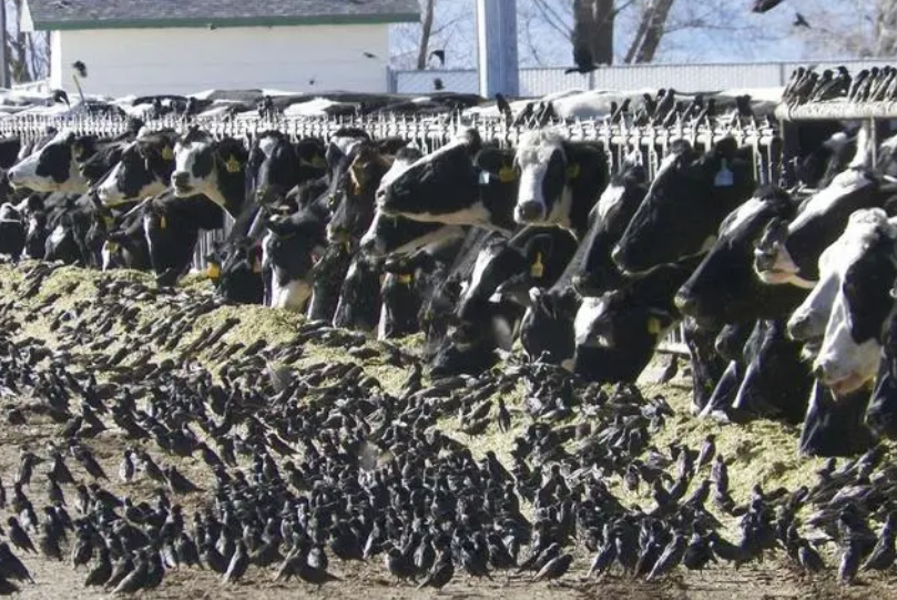 图:北美欧洲椋鸟抢食奶牛的饲料