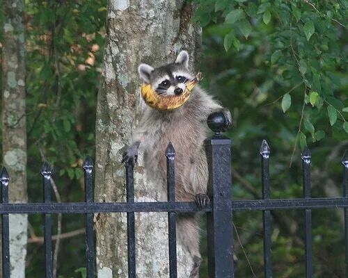 翻垃圾桶已经不能满足浣熊了,它们还会想尽办法潜入人类房子翻箱倒柜找东西吃,偷宠物的粮食吃, 有时候即使有人在有宠物在,它依然会去抢夺,又它的前肢非常灵活,脾气又不好,具有很强攻击性。