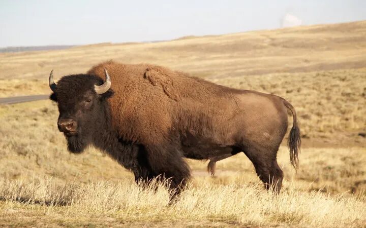 例如,美洲野牛就拥有一个巨大的头骨和一组沉重的角,上面这张(上图)是它傲娇的抬起头的样子,是不是和斑鬣狗有异曲同工之处啊。