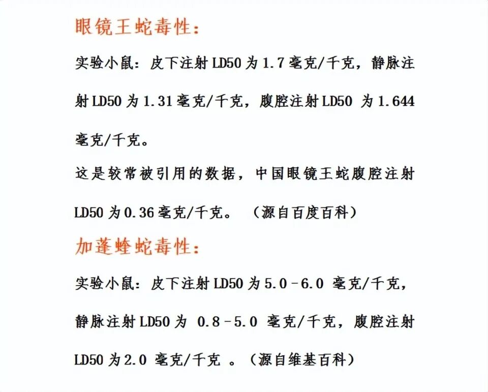两者相比,眼镜王蛇的毒液主要是神经毒素,以及血循毒素,而加蓬蝰蛇主要是就是血循毒素。这意味着,若是皮下注射和腹腔注射,眼镜王蛇的LD50数据更小,毒性更强,若是静脉注射,那么加蓬蝰蛇致死率更高。这在开头的血液实验中,就可以看出来。
