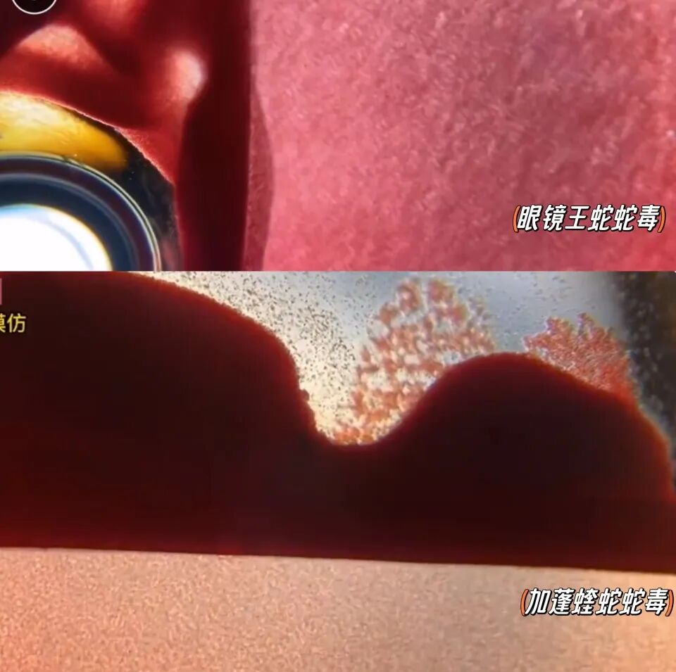 在显微镜下,研究人员在血液的边缘滴了一小滴眼镜王蛇毒液,瞬间人的血细胞就被蛇毒吸引,蛇毒和血液的交界处形成了深红色的血块,这是因为蛇毒和血液发生了溶血反应,短短几秒,血液就被蛇毒破坏了。
