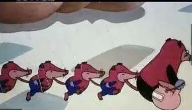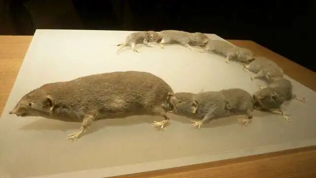 确实,这一长串的奇异生物,是一群长得很像老鼠的小动物,妈妈带头,孩子们衔着其他人的尾巴排成一列跟在后面。