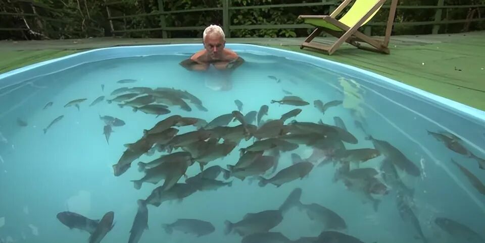 为了验证这些故事的真伪,他决定亲自跳入了食人鲳的池水里。