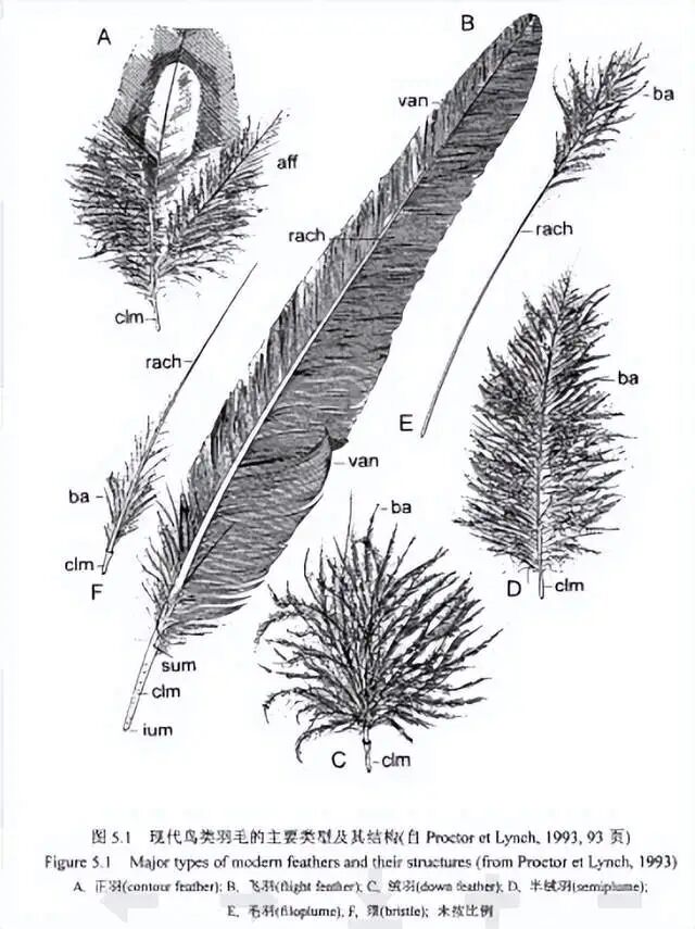 现代鸟类并不是只有一种羽毛,它们身上有各种各样不同功能的羽毛,比如用于包裹全身的正羽(图中A),以及主要生长在两翼的大长羽毛——被称为飞羽(图中B),用于帮助飞行。