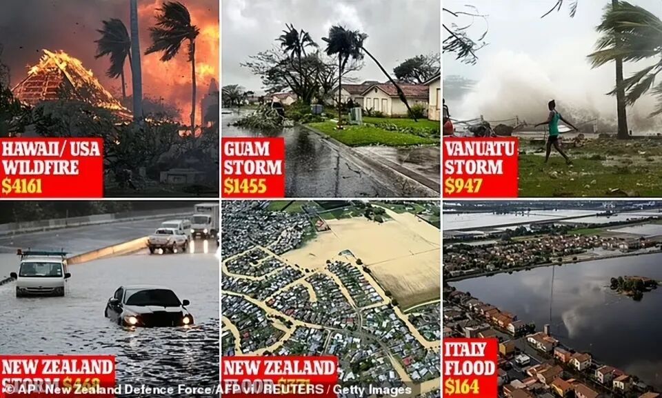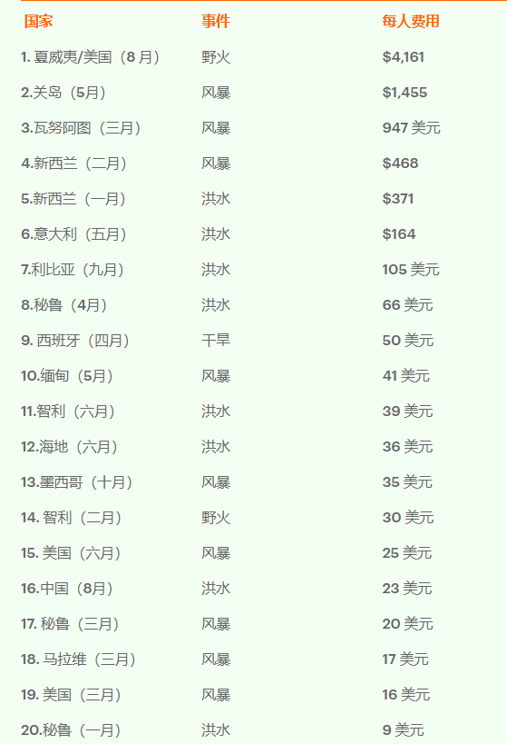 其次是5月份的关岛热带风暴,人均损失为1455美元,第三则是瓦努阿图风暴(947美元),第四第五都是新西兰的,风暴损失人均468美元,洪水损失人均371美元。