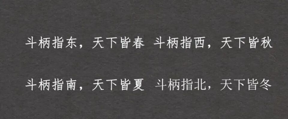 古代中国人其实是观察北斗七星斗柄朝向来确定四季的,因为地球的公转和自转,北斗七星斗柄朝向在一天的不同时刻,以及一年中任何一天的同一时刻朝向都是不同的,古代中国人是根据初昏时刻的斗柄朝向来确定四季的。