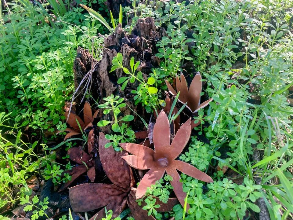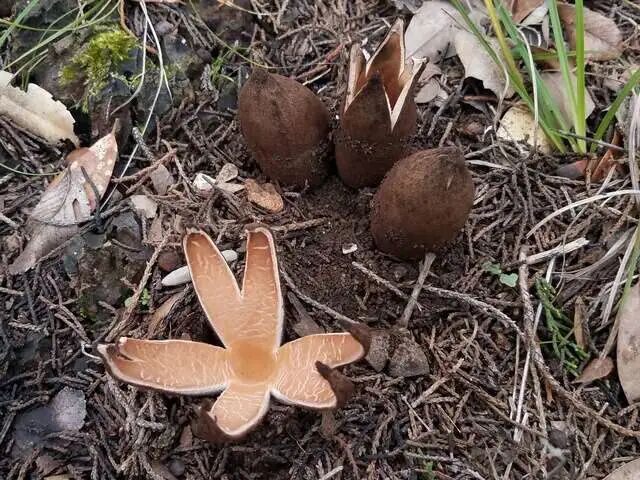 不仅如此,这种蘑菇的外形也很奇特,不是常见的伞状蘑菇,而是放射状“星形”的,星形蘑菇角的数量还不一样,有的是五角星,有的是七角星,还有一些可能是三角、四角或八角。