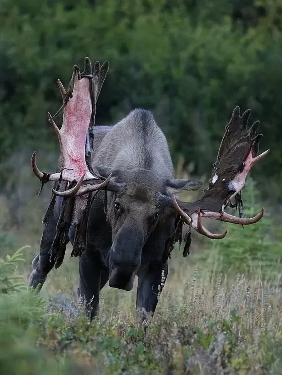 而脑袋上会留下带血的伤口,不就后就会自动愈合,新鹿角也在这个位置重新开始生长。