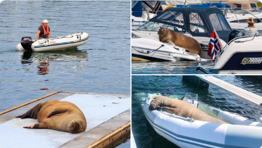 2022年,网红雌性海象弗雷亚突然出现在岸边的小船上,迟迟不肯离开。