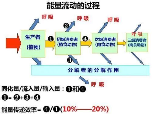 我们都是从燃烧的太阳那里获取能量,生产者(植物)获取到能量后到达食草动物(初级消费者)的能量只有10%-20%,从太阳那里获取的总能量就是以这种方式在食物链中是逐级递减(如下图)。
