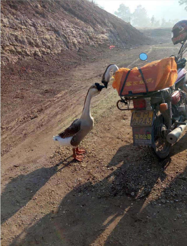 在互联网上曾经流传过这样一张照片:一只被绑在摩托车上的大鹅与另一只似乎是它的伴偶的大鹅“吻别”。