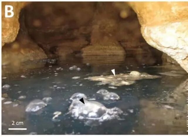 研究者发现,在洞穴中经常能看到白色的漂浮在水面的东西,这些就是细菌。