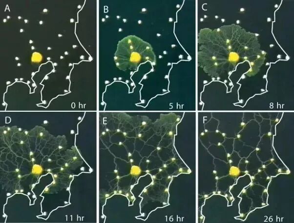 研究人员将多头绒泡菌放在了一个与日本东京版面一样的塑料模板中,然后在“东京”的各个“交通枢纽”上放置了食物。