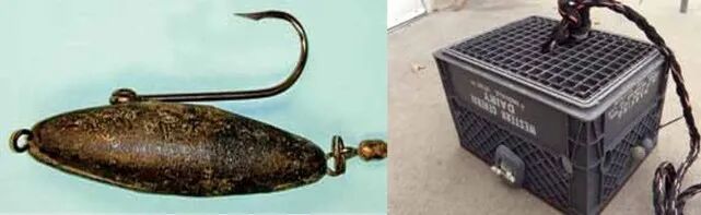 另一个选择是帮助鱼下降到一个安全的深度,这就会用到一些工具了,比如一个配重箱和配重鱼钩(如上图),让鱼和重物一起下层,确保鱼能够到达舒适深度,它自己挣脱或者我们帮助打开。