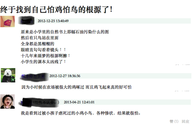 我在论坛上找到很多人恐鸡的根源都是如此,有人看到了有污染的鸡,有人被恶鸡啄过,有人看到别人虐鸡,这些心理阴影让它们长久以来怕鸡。