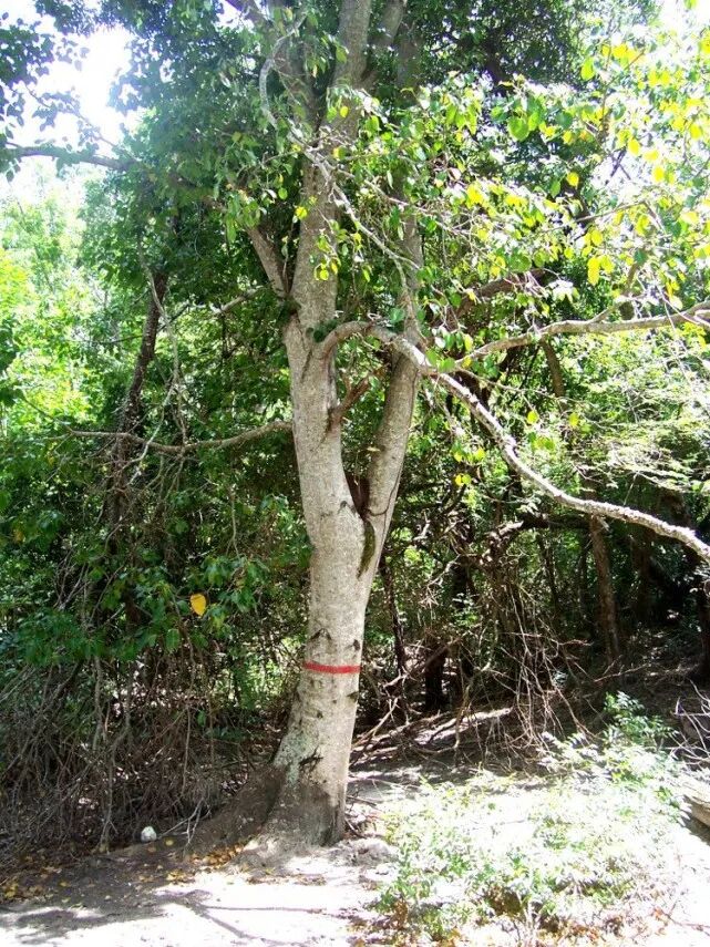 因为整个树干都含有这些有毒物质,所以它是摸不得的,所以每棵树上都会挂一个红色警示标牌,或画上红圈。
