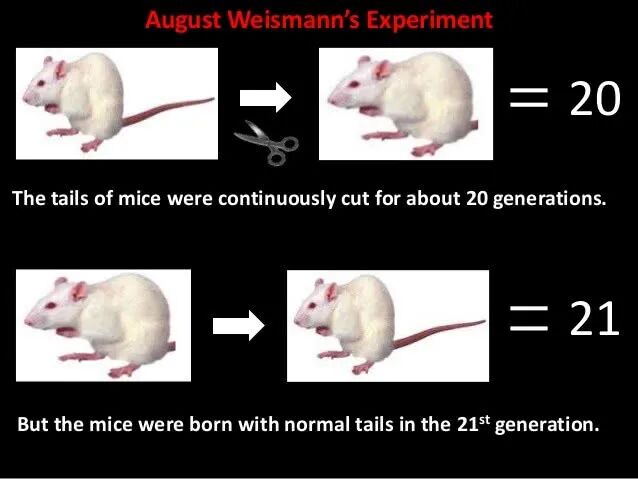 他将第一代小鼠的尾巴切掉,交配后,再将后代的尾巴也切掉,然后第二代再交配,后代的尾巴再切掉,以此往复十几、二十几代后,901只幼崽全部切除尾巴,惊人的发现,即使父母都是人工致残的,产生的后代中,没有一个小鼠尾巴是缺失的,或者是发育不完全的。