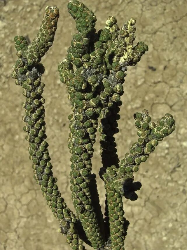 在纳米比亚南部沙漠中发现,有鳞片状的叶子,就像花菜一样,生命力非常顽强,在半沙漠的盐田,36℃的高温下生存下来。