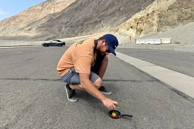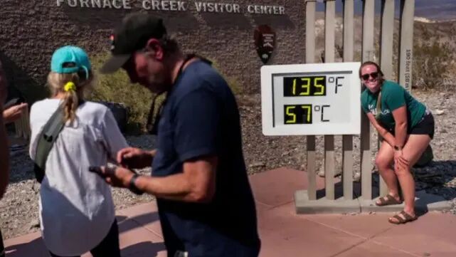 在加州的死亡谷,这里是经常记录到最高气温的地方,在熔炉溪外的一个大型数字温度计记录到135华氏度(57摄氏度),许多游客再次拍照合影。