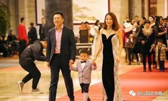 大堂里金碧辉煌,红毯拉满全场,背景音乐响起,幼儿园的家长和孩子盛装出席,红毯走秀!爸爸帅气、妈妈高贵、孩子自然也是充满气质。