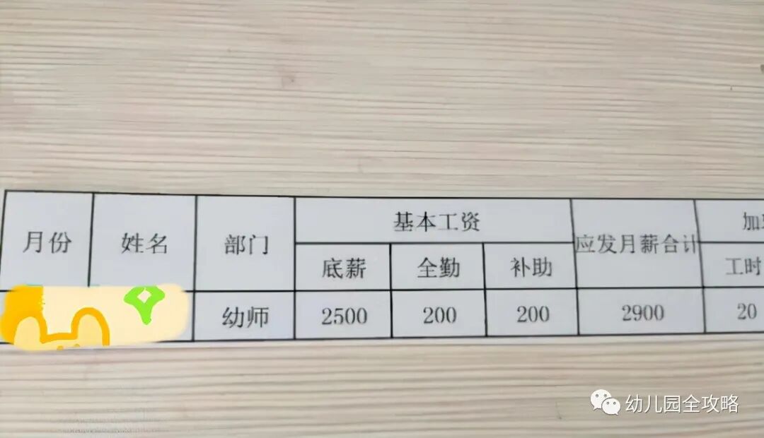 一位幼儿园老师在网上分享了自己的工资条,应发月薪合计:2900元。