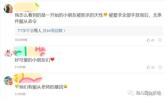 说幼儿园的老师扼杀孩子们的天性,要求孩子们无条件服从命令,还必须把手全部放在后面背背好。
