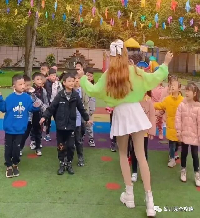 我们可以看到这位女老师的穿着打扮,小短裙是日常标配了,有的时候还会有一些特别的改变。不得不说如果是这样的打扮出现在幼儿园以外,的确算得上是一位潮流青春美少女,但是在幼儿园这样穿着的话,还能算是一名称职合格的幼儿园老师吗?