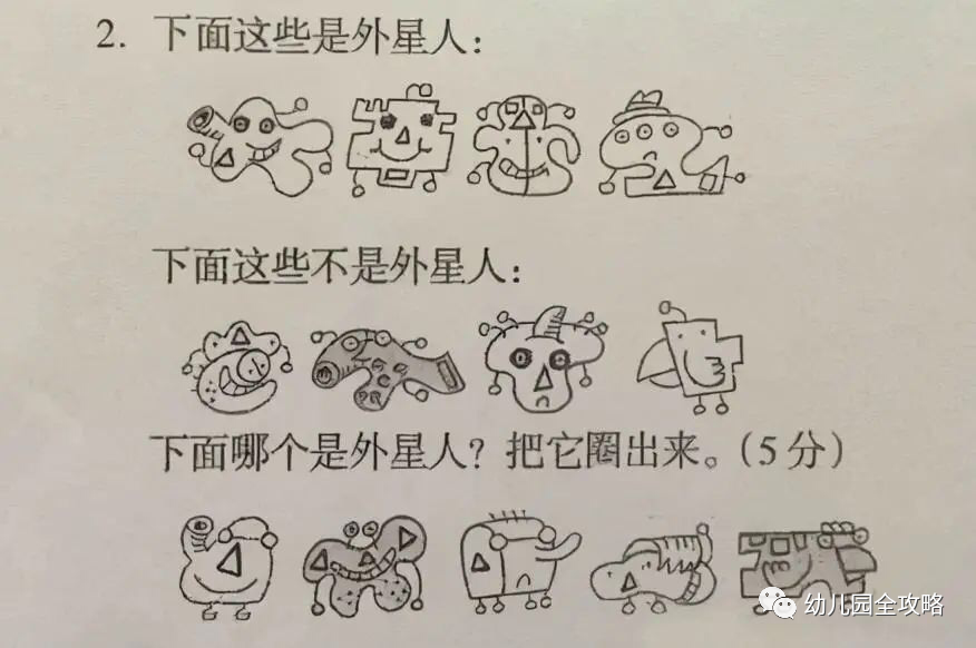 首先给你列举两个例子,这些是外星人,这些不是外星人,最后再让你从几幅图中选出哪一个是外星人。