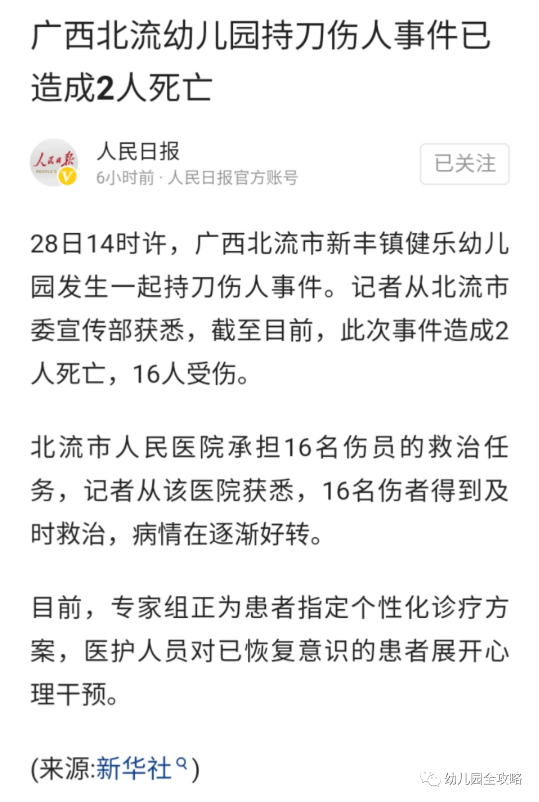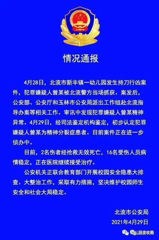 一名男子持刀闯入幼儿园,伤害了16名师生,已造成两人死亡。