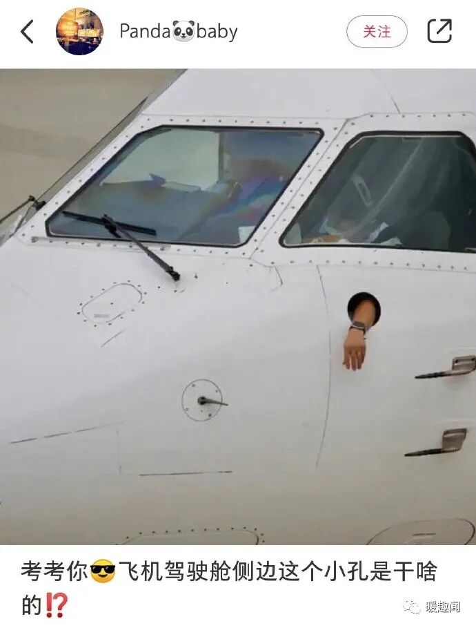 #科普:这个洞叫whiskey hatch在SAAB 340和SAAB 2000以及部分ATR 72上装在侧面(其他个别飞机也有,但不在这个位置),在SAAB飞机上的用处就是如果舱门已经关闭,飞行员可以打开这个洞来接收更新的文件等等. 比如接收地勤人员给的货仓重量数据,以便做配重计算等等。#