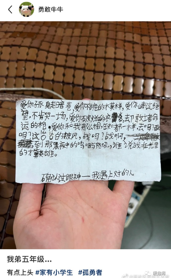 网友分享五年级弟弟写的小纸条
