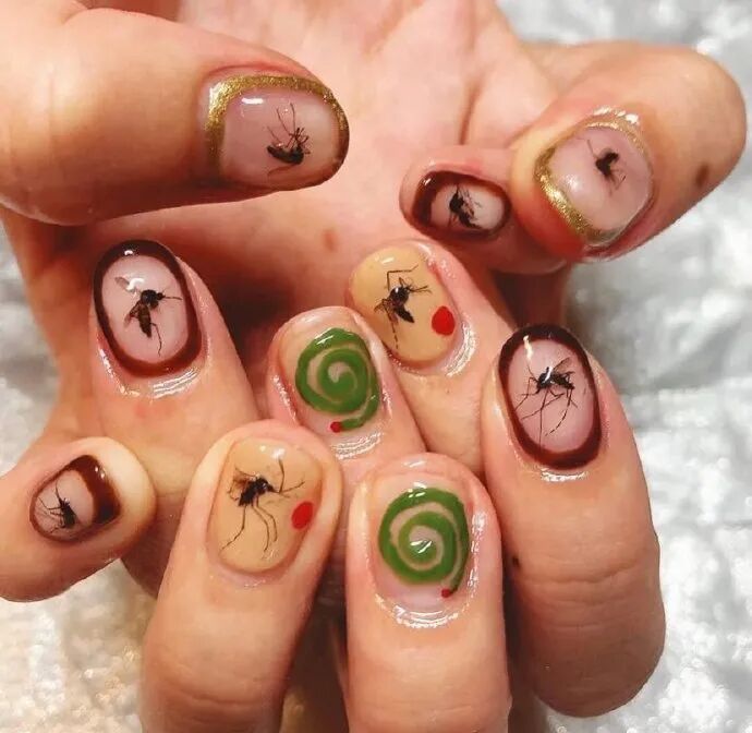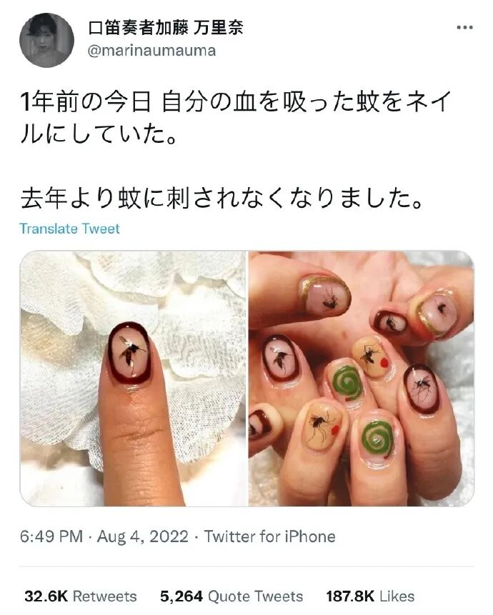 日本小姐姐说她把吸过她血的蚊子做成美甲后,就不怎么被蚊子咬了!