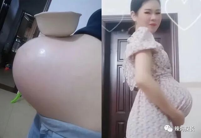 只见这位孕妈妈的肚子,从侧面看又长又尖,突出的肚子与身体像是90度的直角高高隆起。而她又在肚子上放了一个碗,就像放在了桌子般平稳,大家不禁感叹: