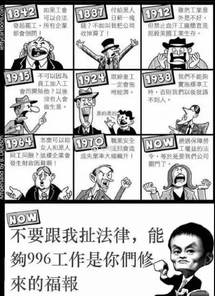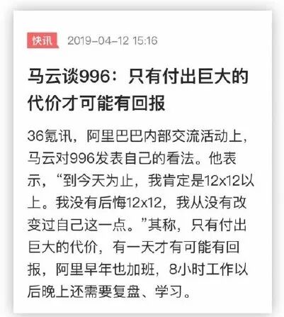马老师从来不跟你谈996的本质是什么,996应该不应该,不给加班费996应该不应该,他谈什么呢?谈996是一种幸福,是一种福报,要讲成就感,要讲有意义。讲马老师自己也996,不仅996,还12x12。