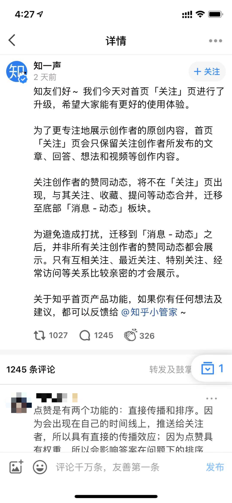 如今改版以后,当去掉这个赞即转发的机制以后,等于是说,知乎用户没有了转发功能,除非发布原创内容,时间线上将不会有别的内容,看起来符合知乎官方解释的「更专注地展示创作者的原创内容」。但是另一面是,创作者的粉丝将不再具有价值,除非点开下方的动态页,否则他们的点赞无法形成二次传播,而原来不需要动作就能浏览的时间线,现在必须需要至少两个动作才能完成,等于增加了获取信息的门槛。