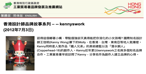 对潮玩了解不多的人,可能会认为Molly这个IP是由泡泡玛特一手打造的,在遇到泡泡玛特之前,它只是一个名不经传,呆在小角落吃灰的小玩意儿。但事实上,早在2012年,Molly已在香港、台湾、东南亚等地已打响了知名度,设计师王信明还因此获得了香港工商贸易署的邀请接受采访。