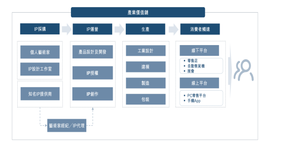 在造股书上,泡泡玛特曾强调「IP是我们的业务核心」,并且如此归纳了中国潮流玩具零售市场的价值链 :