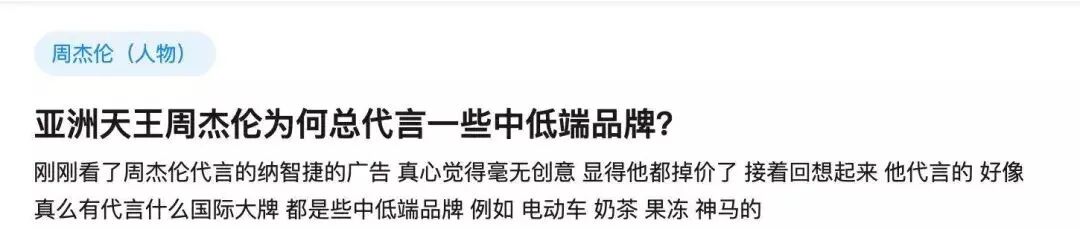 同样的成功,还有一个人。周杰伦,我在《蔡徐坤距离周杰伦只差8105辆洒水车》一文中说过,周杰伦的定位,就是年轻人,他的造型,他的说话口气,都是年轻屌丝的范儿,这不是贬低周天王,而是说他的定位非常到位。你看他的代言,全是中低端品牌,英雄联盟、电动车、奶茶、接个车广告,也是纳智捷,这不是天王就真的low,而是他的定位非常清楚,他就是草根年轻人代表,所以他的产品「年轻人买得起」,题外话,我觉得雷军当年不找周杰伦代言小米真的是个失策。