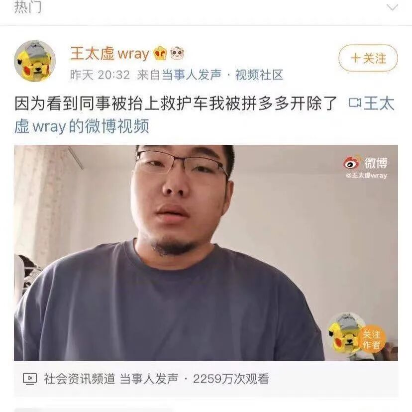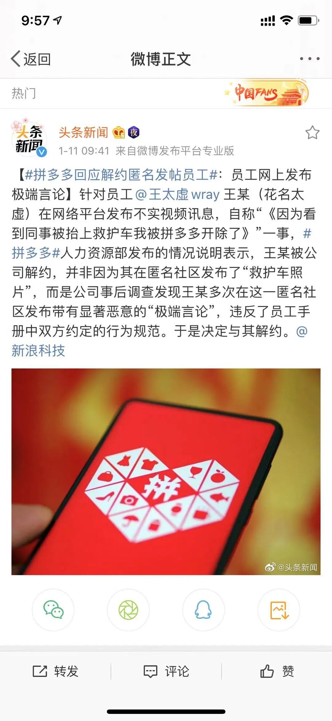 但更魔幻的是,还是1月8日,一个叫王太虚的博主自称《因为看到同事被抬上救护车,我被拼多多开除了》,作为拼多多的员工,他解约的原因是因为其在匿名社区发布了「救护车照片」,拼多多的回复是,解雇他的原因不是王某发布照片,而是多次在该匿名社区发布带有显著恶意的「极端言论」。