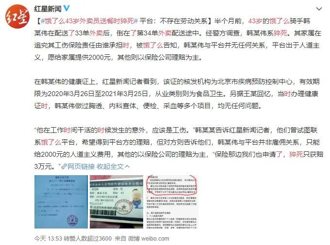 半个多月前,43岁的饿了么骑手韩某伟在配送了33单外卖后,倒在了第34单外卖配送途中。他家属在索赔工伤保险时,被告知:饿了么出于人道主义,愿给家属提供2000元。