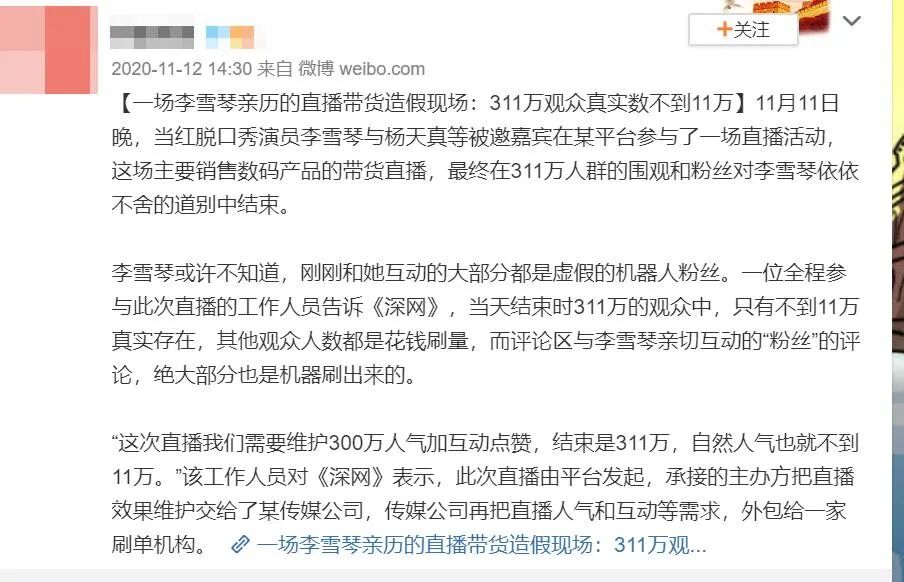 我非常记得一件事,当年的CCTV还因为带头「领掌」被批评。但是就在11月11日,李雪琴与杨天真等被邀嘉宾在某平台参与了一场直播活动,这场主要销售数码产品的带货直播,场面十分火爆,311w人在线,无数粉丝与李雪琴亲切互动。据《深网》的一篇报道,当天结束时311万的观众中,只有不到11万人真实存在,其他观众人数都是花钱刷量,而评论区与李雪琴亲切互动的「粉丝」的评论,绝大部分也是机器刷出来的。