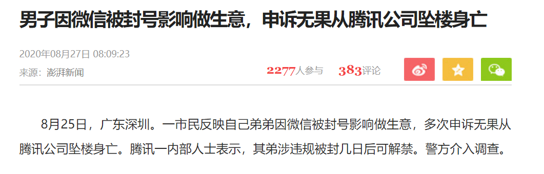 2020年,某社交平台封禁了一个男子的账号,一男子因被封号影响做生意,多次申诉无果坠楼身亡。